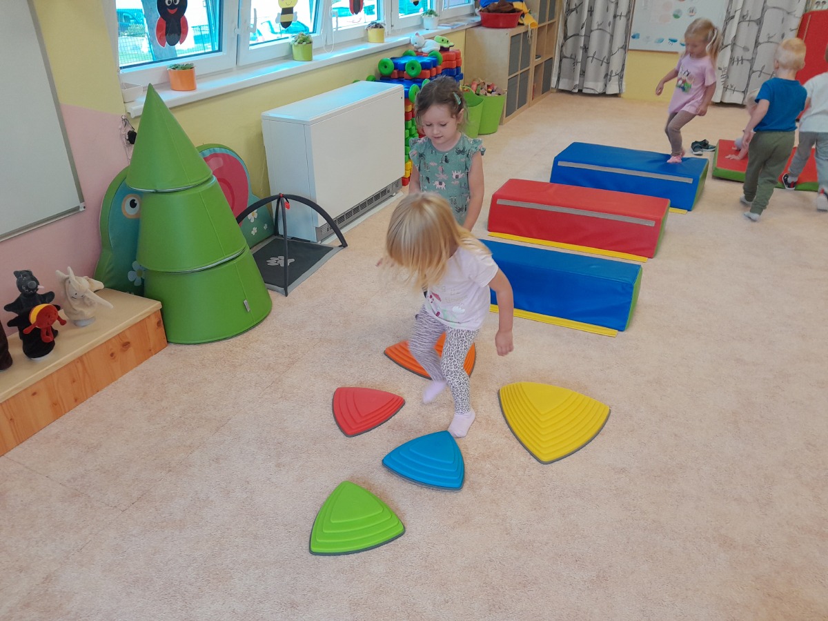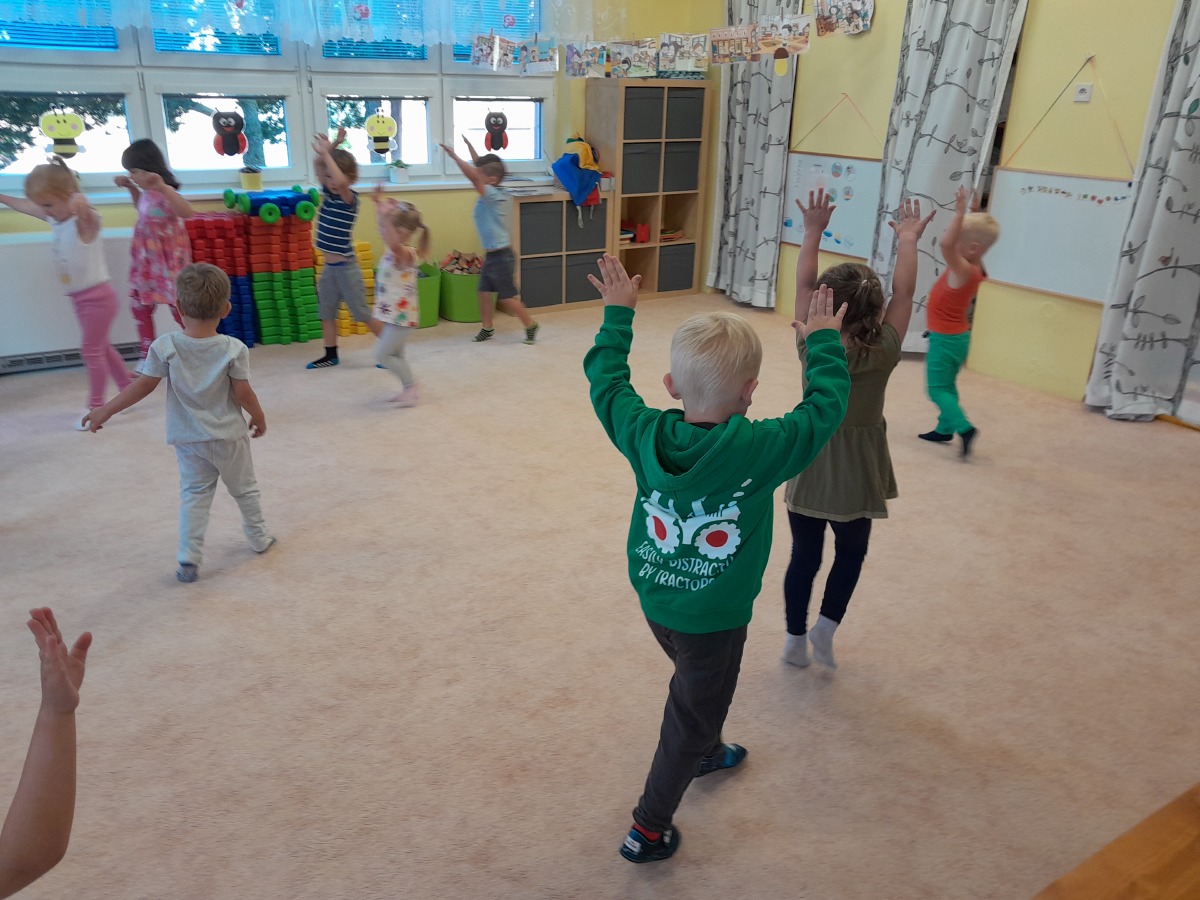 - Každé ráno cvičíme. Hrajeme pohybové hry: "Na sochy" a "Všichni domů". Stavíme si překážkovou dráhu.